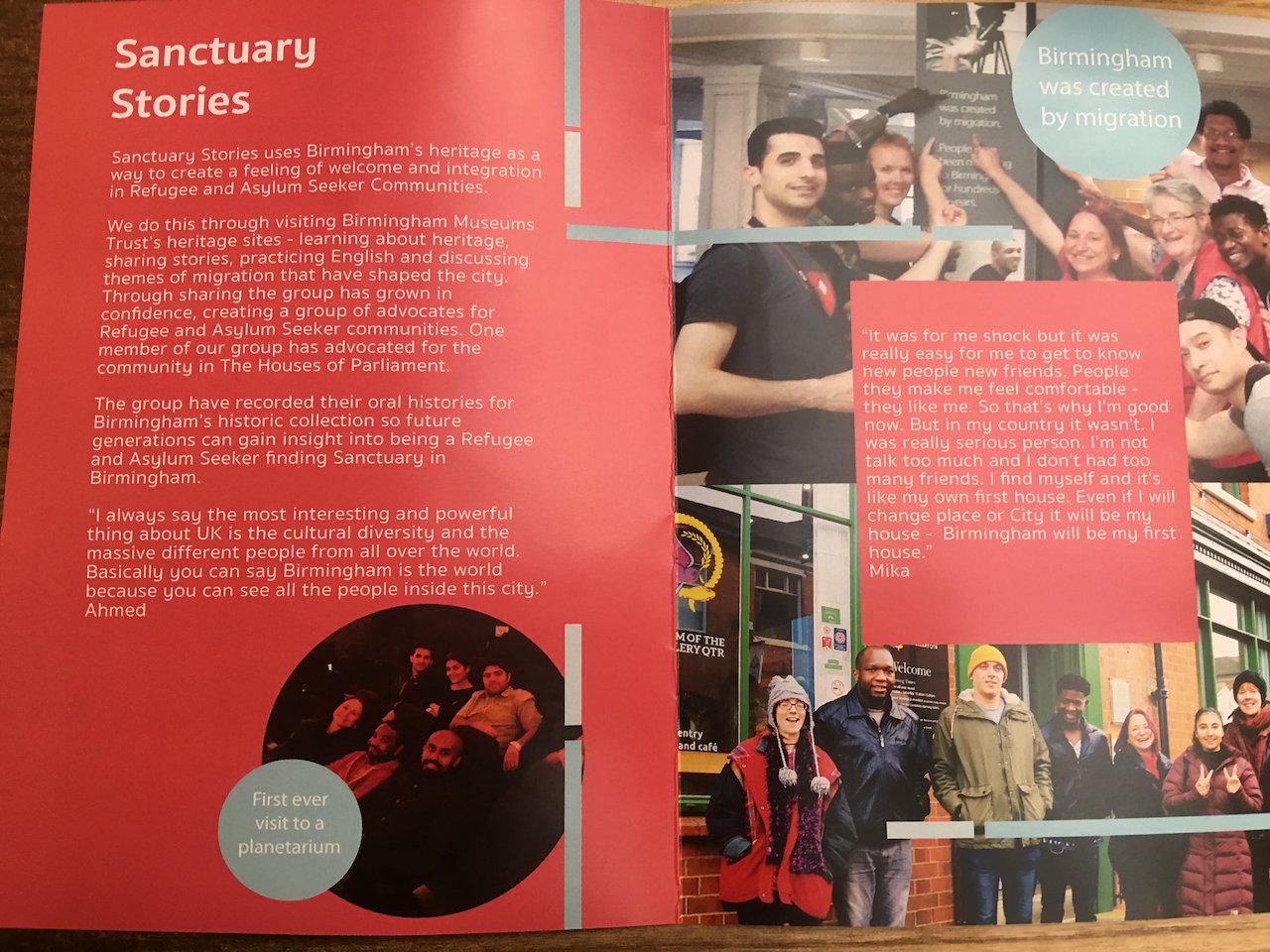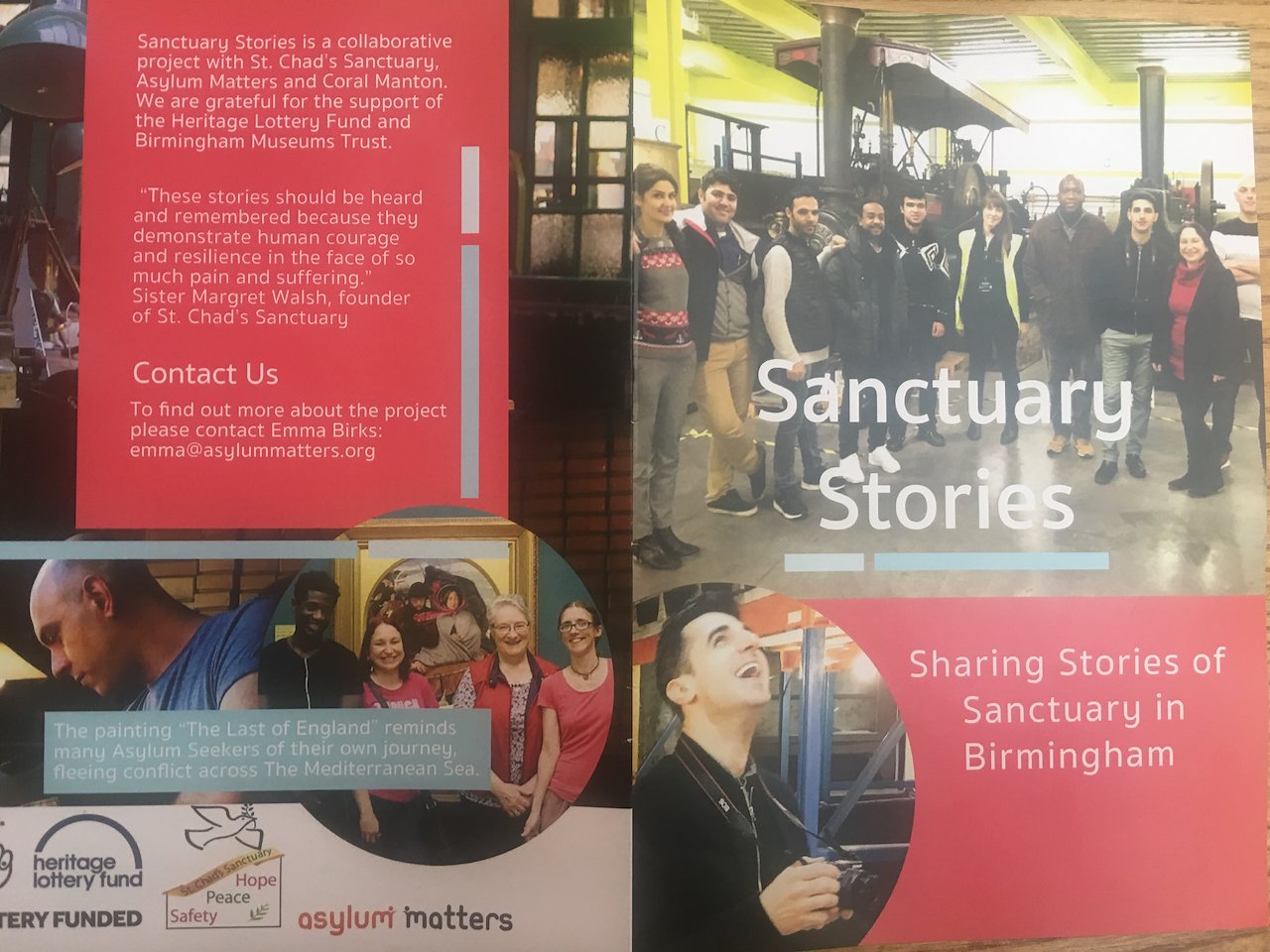 Sanctuary Stories is a Heritage Lottery Funded collaborative project with Asylum Matters and St. Chad’s Sanctuary in Birmingham. The project seeks to create a sense of welcome in Birmingham for refugees and asylum seekers through visiting/learning about Birmingham’s heritage particularly through themes of migration. The project also looks to improve English Language skills and give the group confidence in sharing their stories and creating advocates for their community. – One of them has already spoken as part of a report in the Houses of Parliament. The stories of the group are recorded as oral histories which will become part of Birmingham Museums Trust’s Collection available for future researchers.
