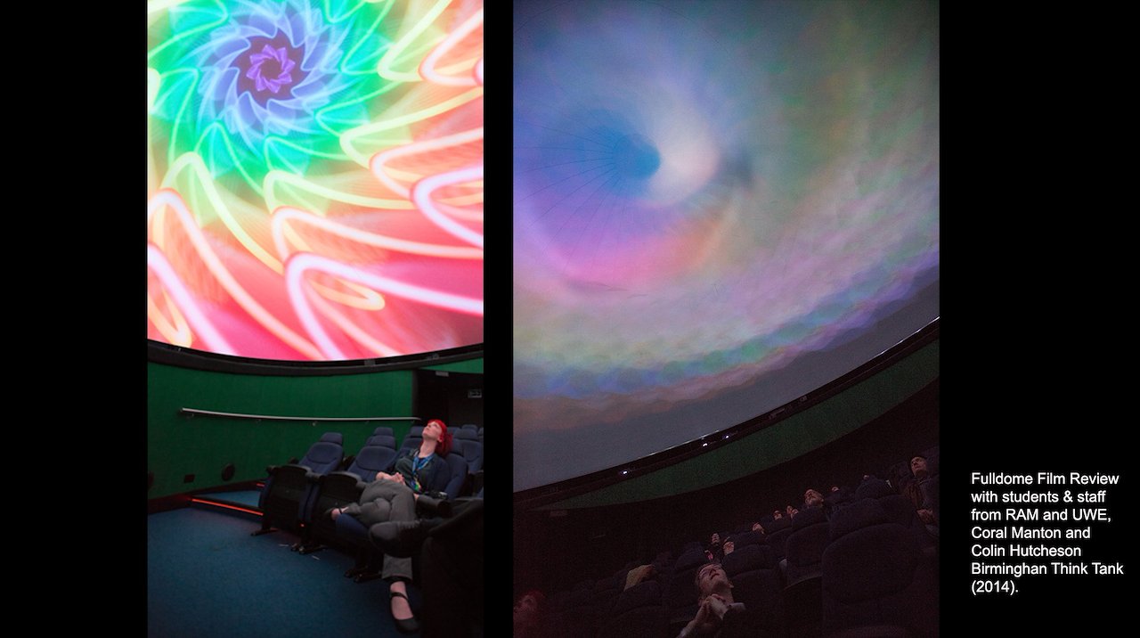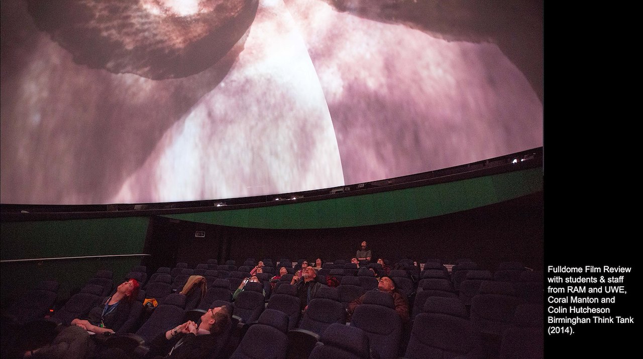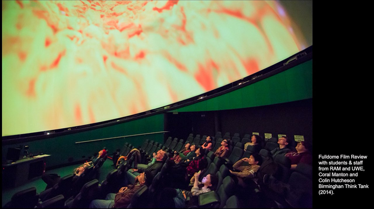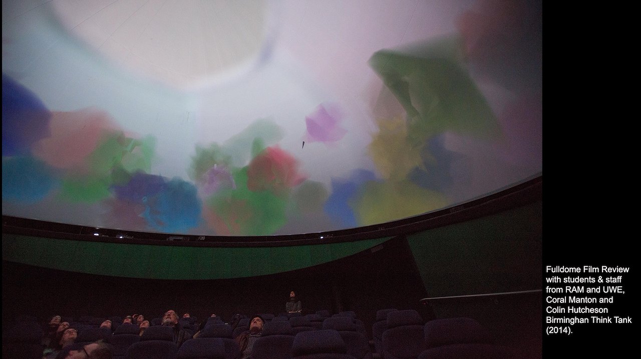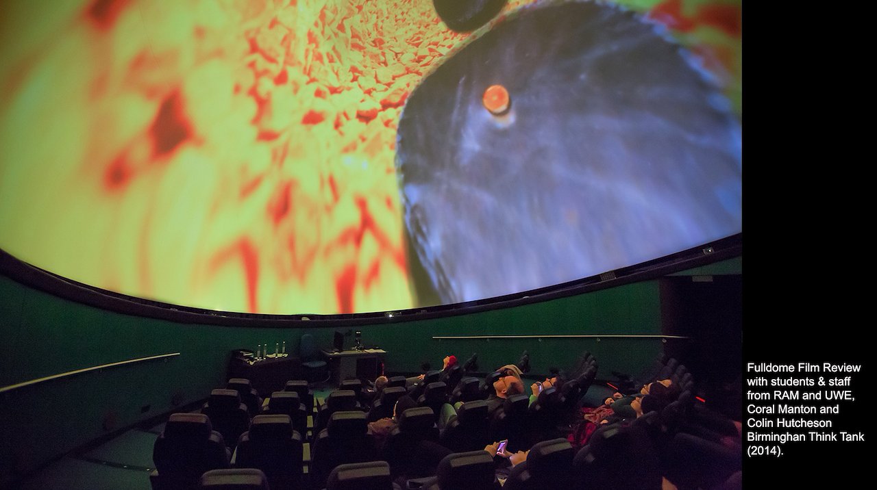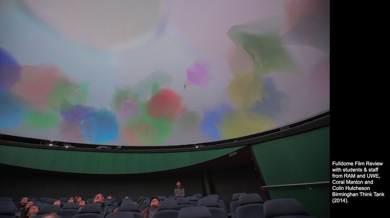 I led two lectures series exploring whether animators and composers could make films in direct collaboration – so not making visuals for sound or sound for visuals – but developing a film where both processes happen concurrently. The space for this project was an immersive cinema/dome cinema. I chose this because the architecture of the dome space and surround sound could act as a shared language for audio/visual design. The lecture series was for postgraduate animation students at The Bristol School of Animation, UWE and postgraduate composition students at The Royal Academy of Music and took place at Birmingham Planetarium.